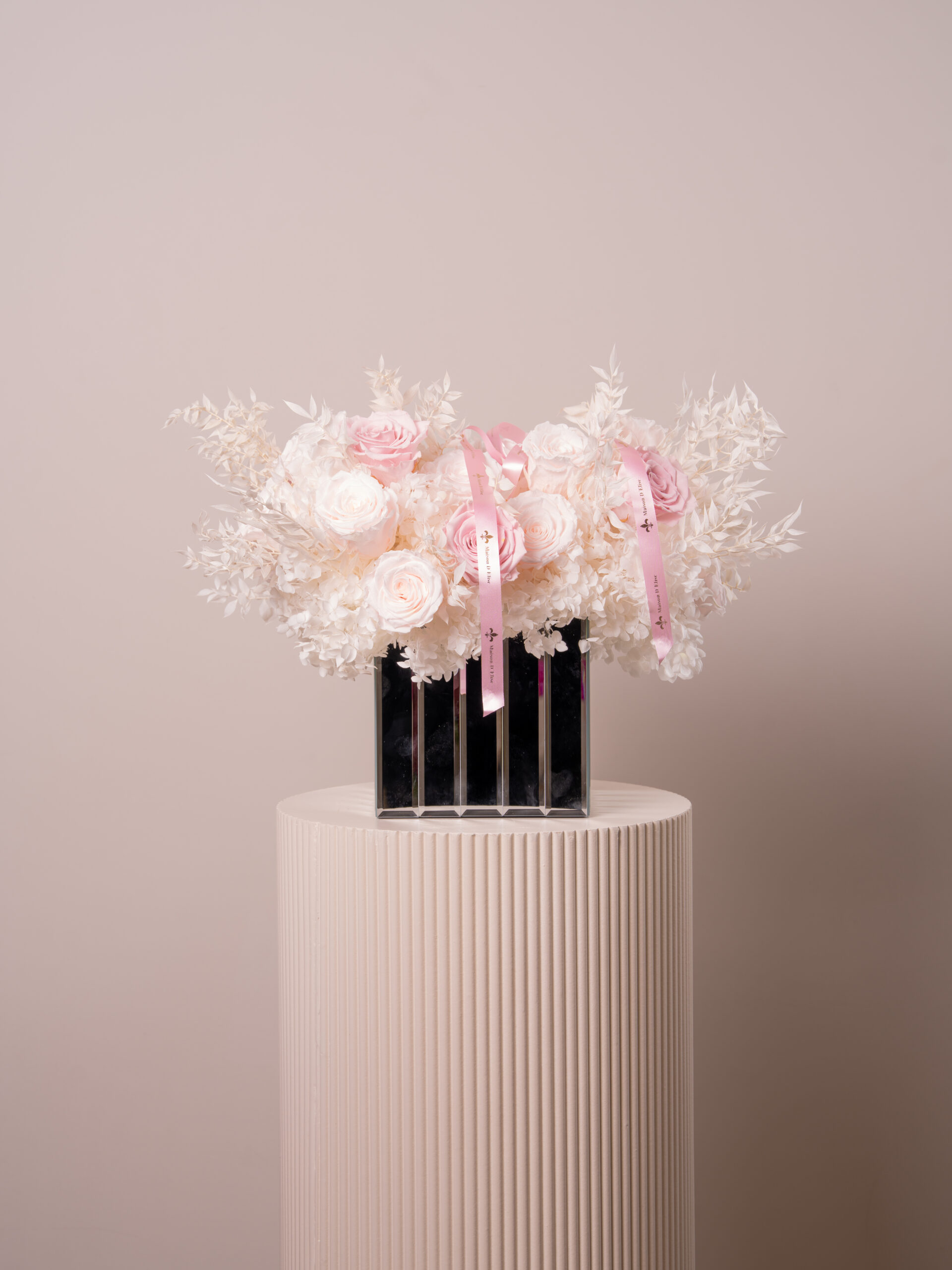 A lasting statement piece of refined femininity, set in a sculptured mirrored vessel. Each bloom is amplified through light and reflection. No maintenance only enduring beauty.