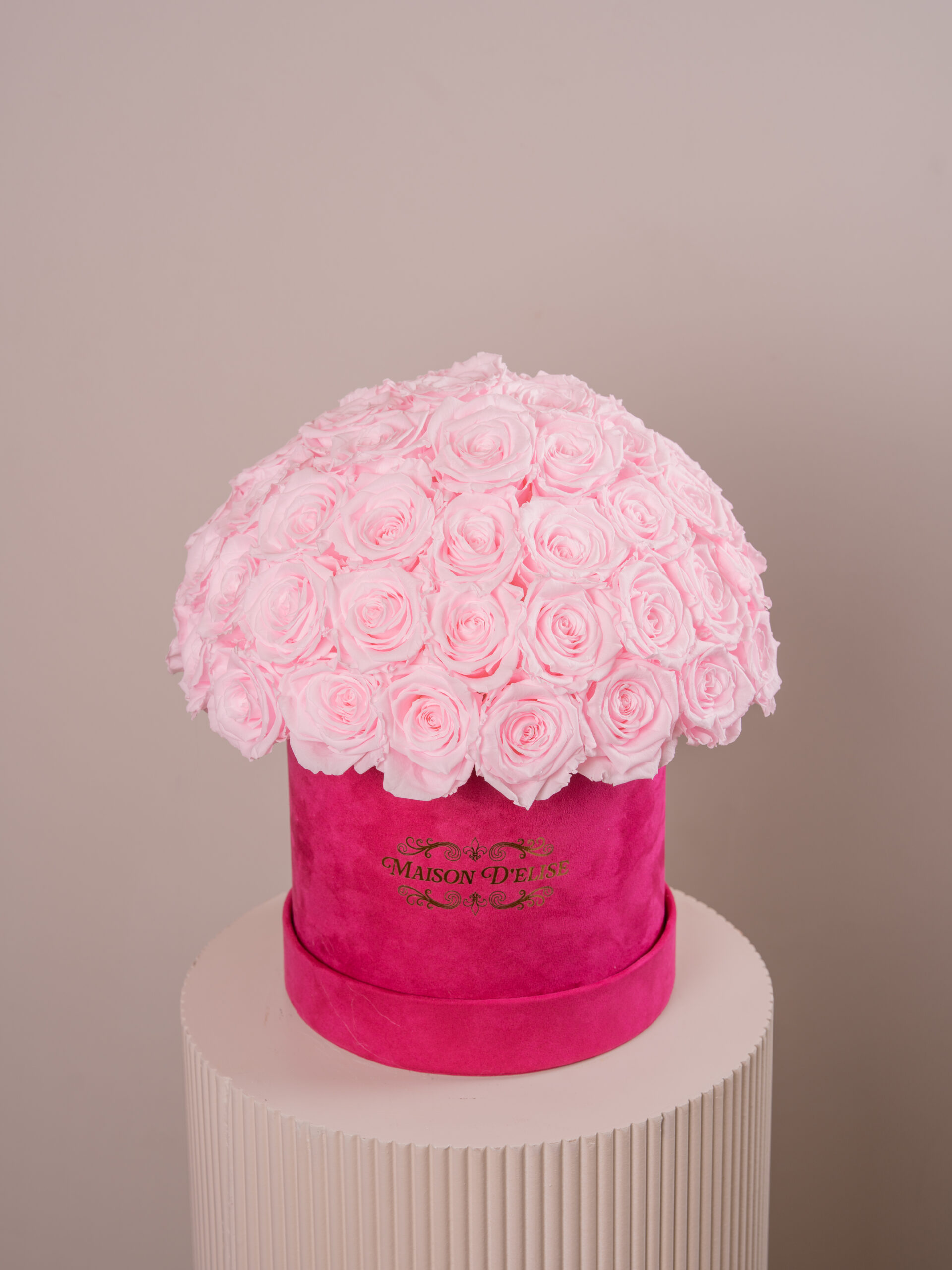 Vibrant velvet hat box with 50 Ecuadorian light pink roses meticulously arranged.